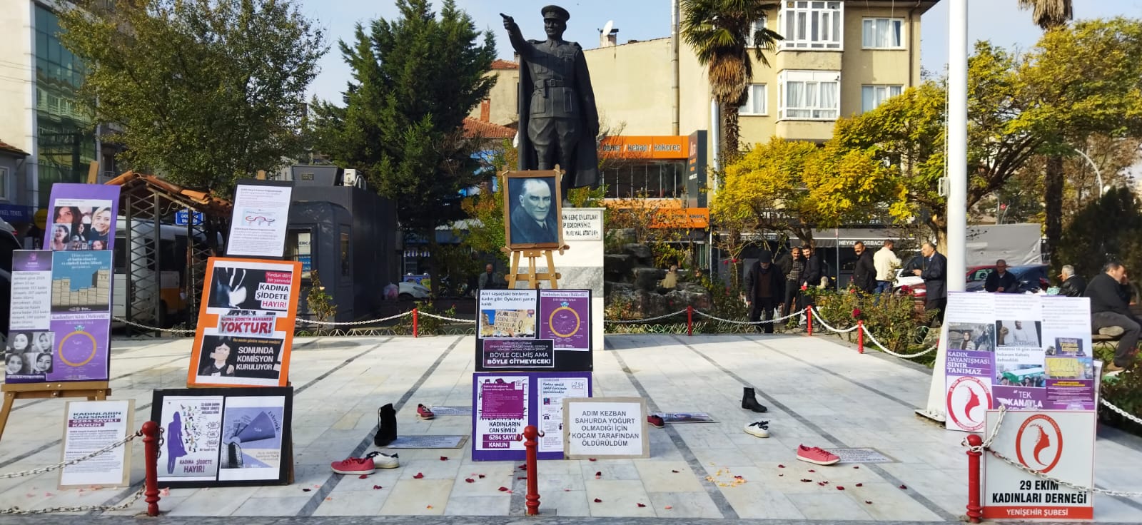 29 Ekim Kadınları Derneği Yenişehir Şubesi, 25 Kasım Kadına Karşı Şiddetle Mücadele Günü farkındalık yaratıp duyarlılık oluşturmak amacıyla hazırladıkları görsellerle Atatürk Anıtı önünde basın açıklaması yaptı. Kadına Yönelik Şiddete Karsı Uluslararası Mücadele Günü’nün anlatıldığı basın açıklamasında şu görüşlere yer verildi.